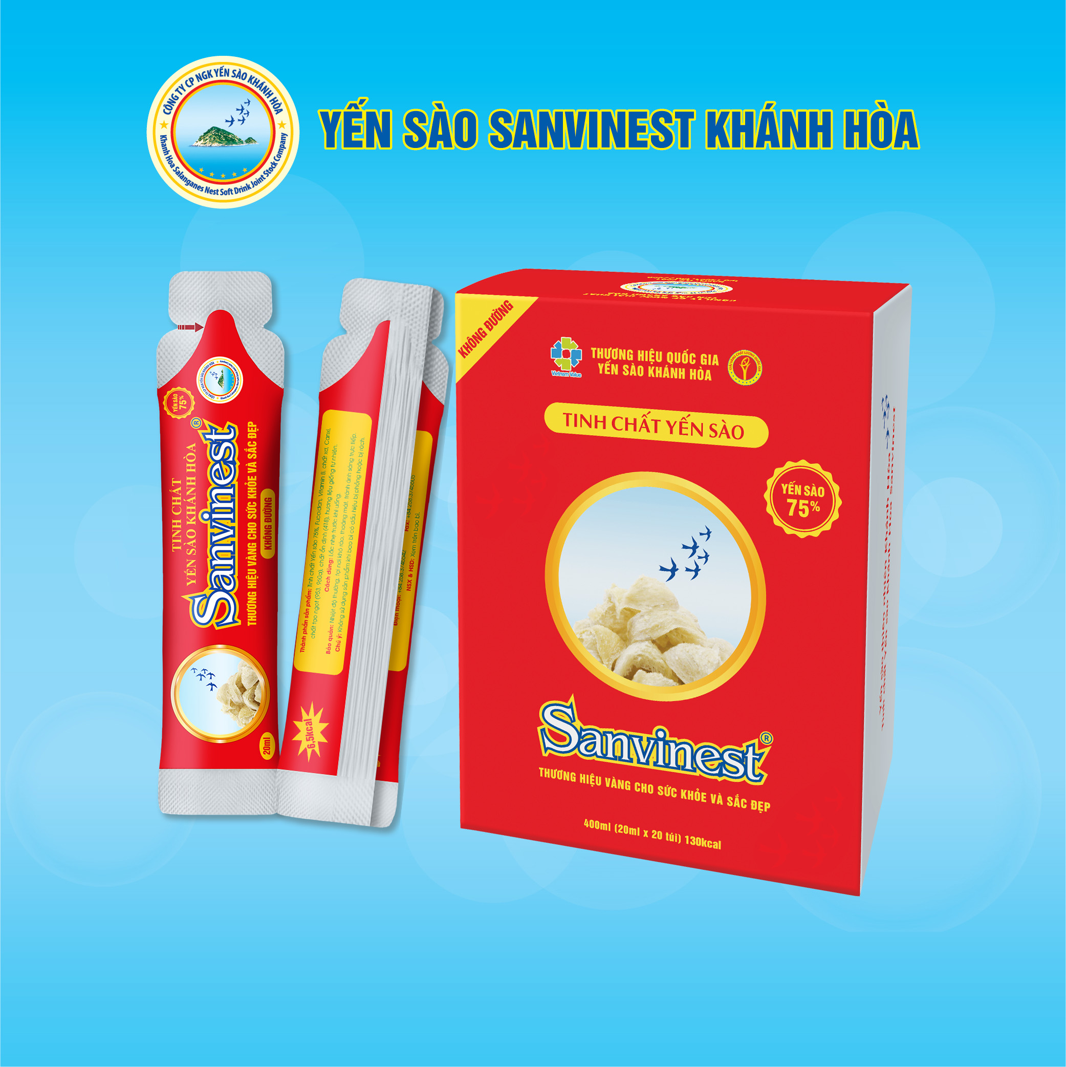 TINH CHẤT YẾN SÀO KHÁNH HÒA SANVINEST KHÔNG ĐƯỜNG được sản xuất từ nguồn Yến sào thiên nhiên do Công ty trực tiếp khai thác kết hợp với Fucoidan, Vitamin B, Canxi và chất xơ.