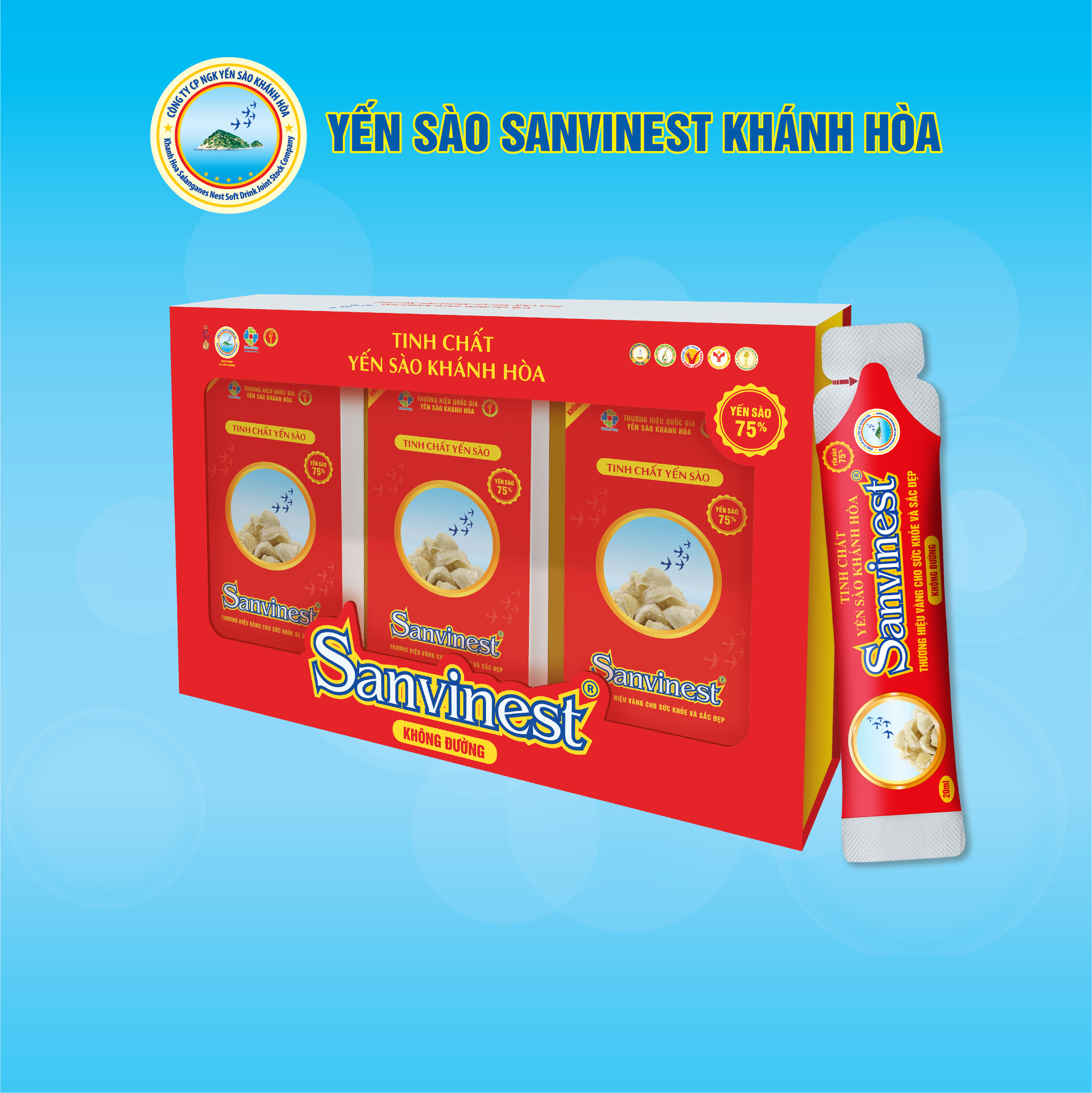 TINH CHẤT YẾN SÀO KHÁNH HÒA SANVINEST KHÔNG ĐƯỜNG được sản xuất từ nguồn Yến sào thiên nhiên do Công ty trực tiếp khai thác kết hợp với Fucoidan, Vitamin B, Canxi và chất xơ.
